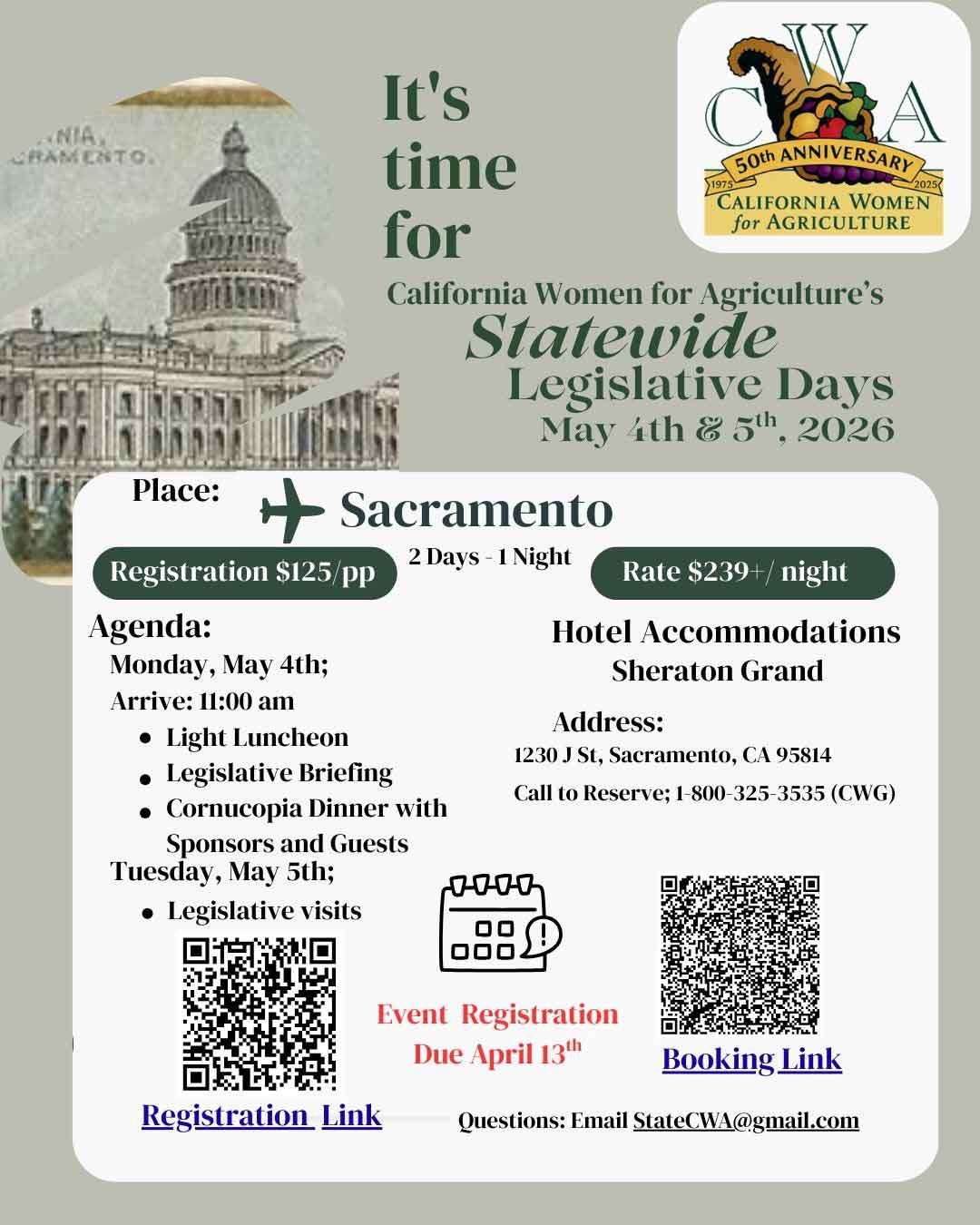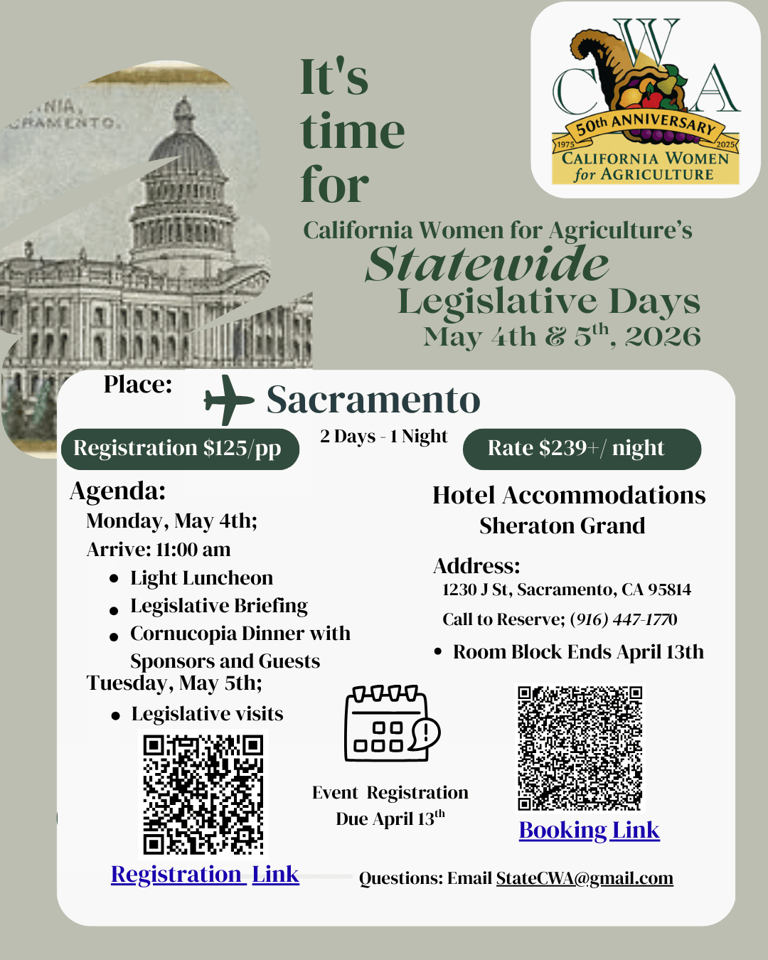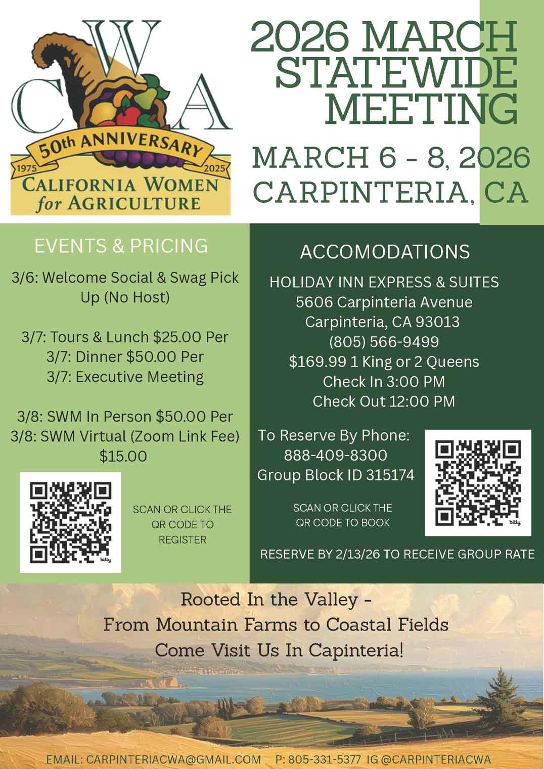 California Women for Agriculture (CWA) was formed in 1975, in the Coachella Valley. The name was chosen to develop a cross section of members. In fact, the nucleus of the first chapter was made up of consumers, as well as farmers and ranchers. Today our membership is as diverse as the industry we represent; bankers, lawyers, accountants, marketing professionals, consumers, AND farmers and ranchers.